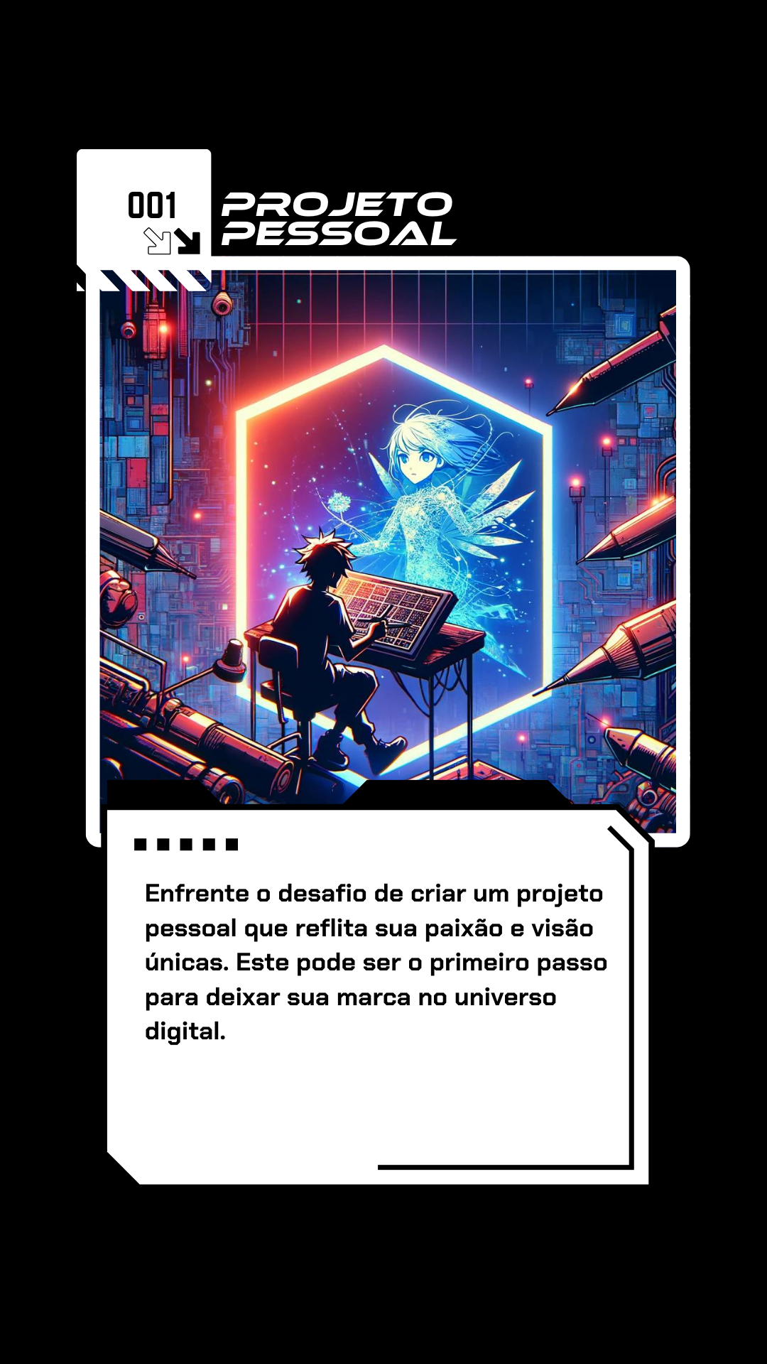 Como seu primeiro projeto, convido você a criar algo que una suas paixões à tecnologia digital. Pode ser uma peça de arte digital, uma miniatura de jogo, ou mesmo um blog sobre sua jornada criativa. O objetivo é começar a colocar em prática os princípios da economia criativa.