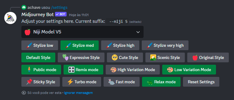 Usando o “/settings” você já deixa suas opções “travadas”. Por exemplo: imagine que você quer fazer uma série grande de imagens e experiências usando a versão Niji 5. Em vez de ficar incluindo no final dos seus prompts “−−niji 5″, você pode usar o painel do “/settings” e definir a Niji 5 como versão padrão dos seus prompts.