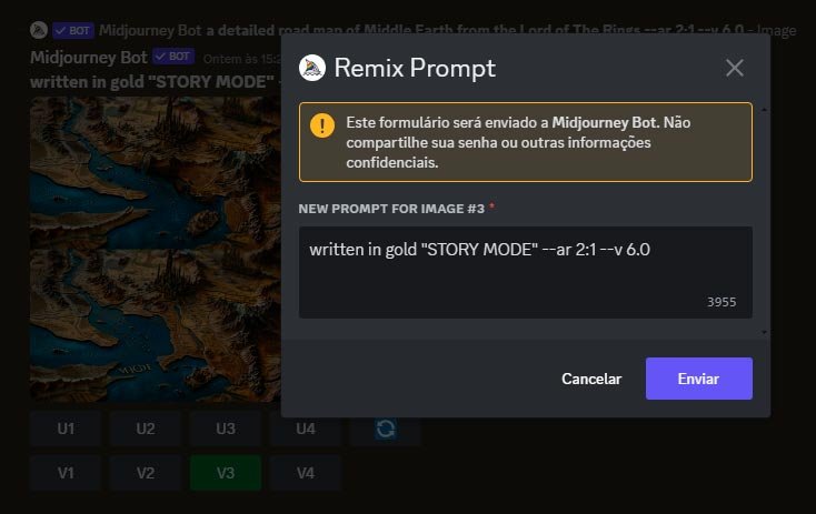 Já, se você está com o modo Remix ativado, você poderá alterar o prompt dessa variação, fazendo inclusões de informações, novos parâmetros ou usando o parâmetro “–no” para remover algo que precisa sair das imagens.