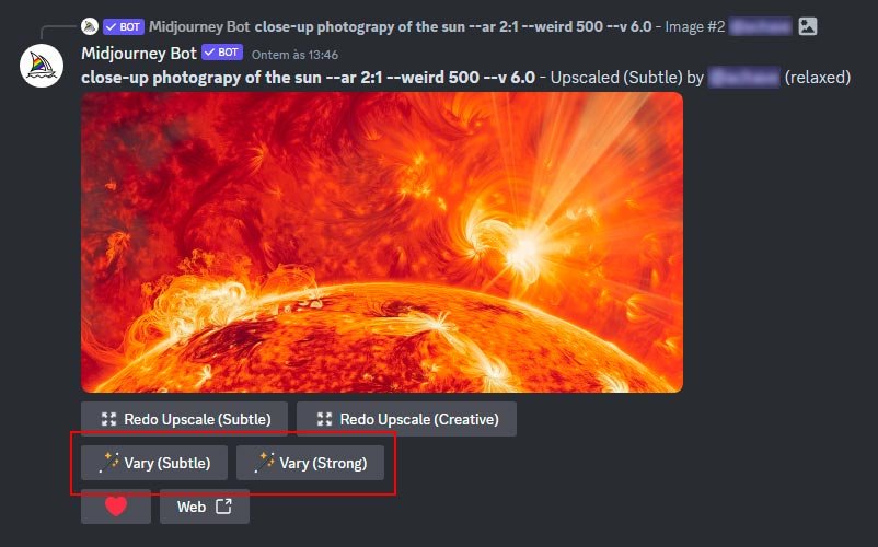 Com o modo Remix ativo, após escolher uma das 4 imagens. As opções de variações como as Vary (Subtle) e a Vary (Strong) também ofercem a opção de alteração do prompt.