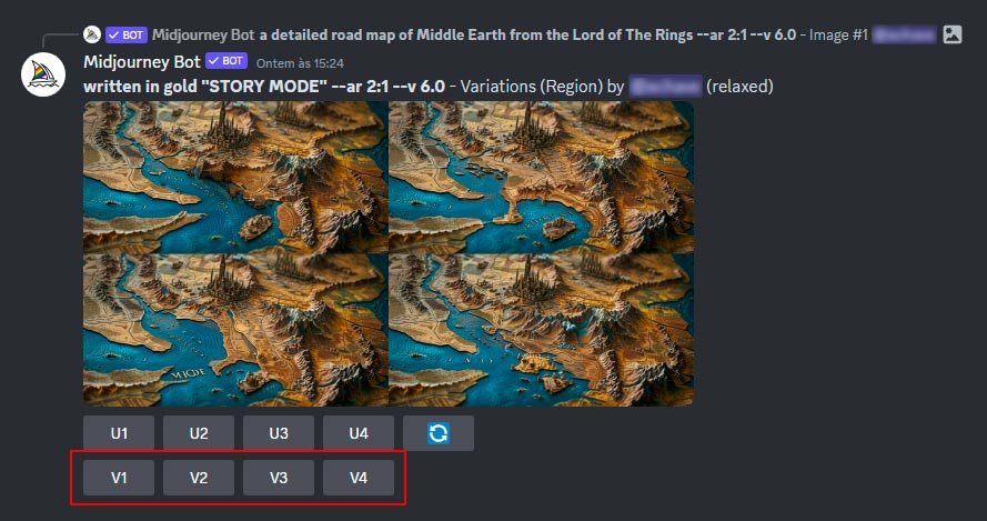 Quando o Midjourney gera um conjuto de imagens baseadas no seu prompt, logo abaixo delas são apresetadas algumas opções para gerar variações das imagens geradas.